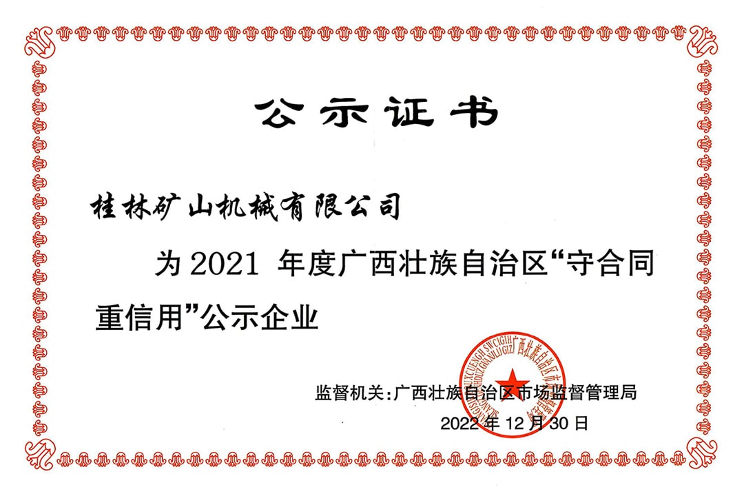 2022年末,自治區(qū)市場監(jiān)督管理局發(fā)布了《關(guān)于公示廣西2021年度“守合同 重信用”企業(yè)名單的通告》,桂林礦機(jī)憑借誠信的經(jīng)營理念和良好的市場信譽(yù)等優(yōu)勢,再獲“守合同 重信用”企業(yè)榮譽(yù)稱號。這份殊榮不僅是桂林礦機(jī)持續(xù)耕耘“以信為本”的努力付出的結(jié)果,更是桂林礦機(jī)“技術(shù)升級、研發(fā)升級、工藝升級、文化升級”的錘煉升級。