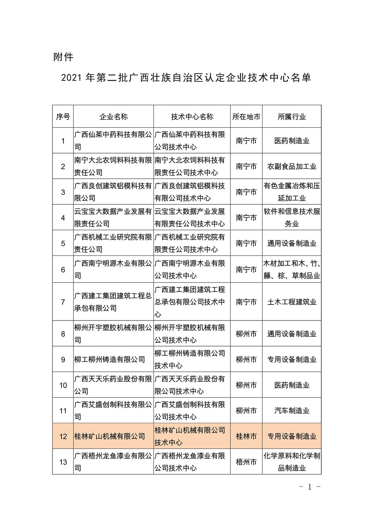 10月29日,自治區(qū)工業(yè)和信息化廳等6部門關(guān)于公布2021年第二批廣西壯族自治區(qū)新認定企業(yè)技術(shù)中心名單的通知(桂工信園區(qū)〔2021〕347號),桂林礦山機械有限公司榮列其中,被認定為自治區(qū)企業(yè)技術(shù)中心。這標志著桂林礦機在科技創(chuàng)新能力,新產(chǎn)品研發(fā)等方面較大的優(yōu)勢,同時體現(xiàn)了公司注重科技投入和技術(shù)創(chuàng)新方面的卓越成就。
